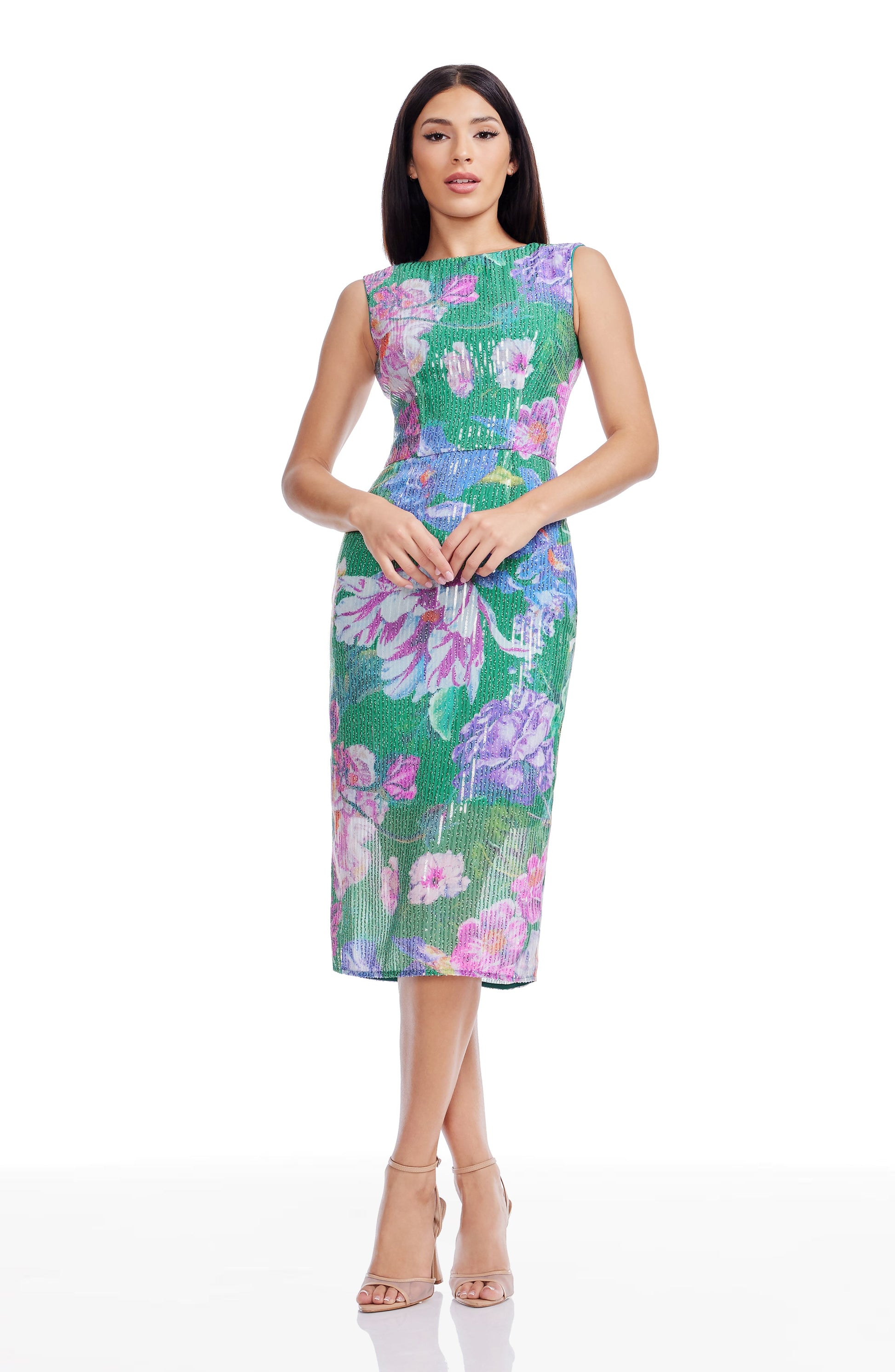 - Floral printed sequin on chiffon fabric, short lined in non-stretch CDC