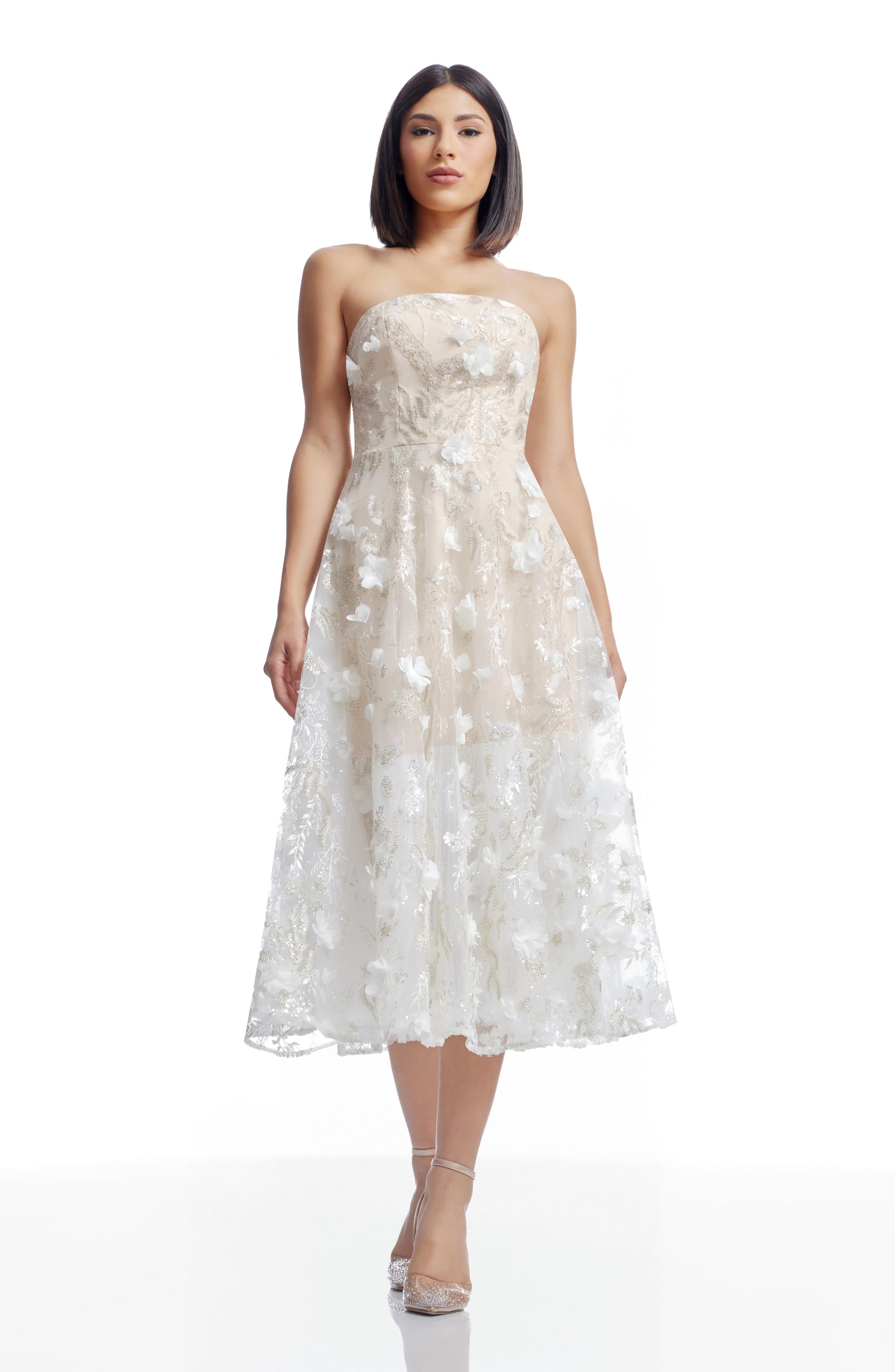 - Fabric features hand sewn 3D flowers, beading, and sequins, skirt is short lined in CDC (no stretch) *the lining of the white variant is off white