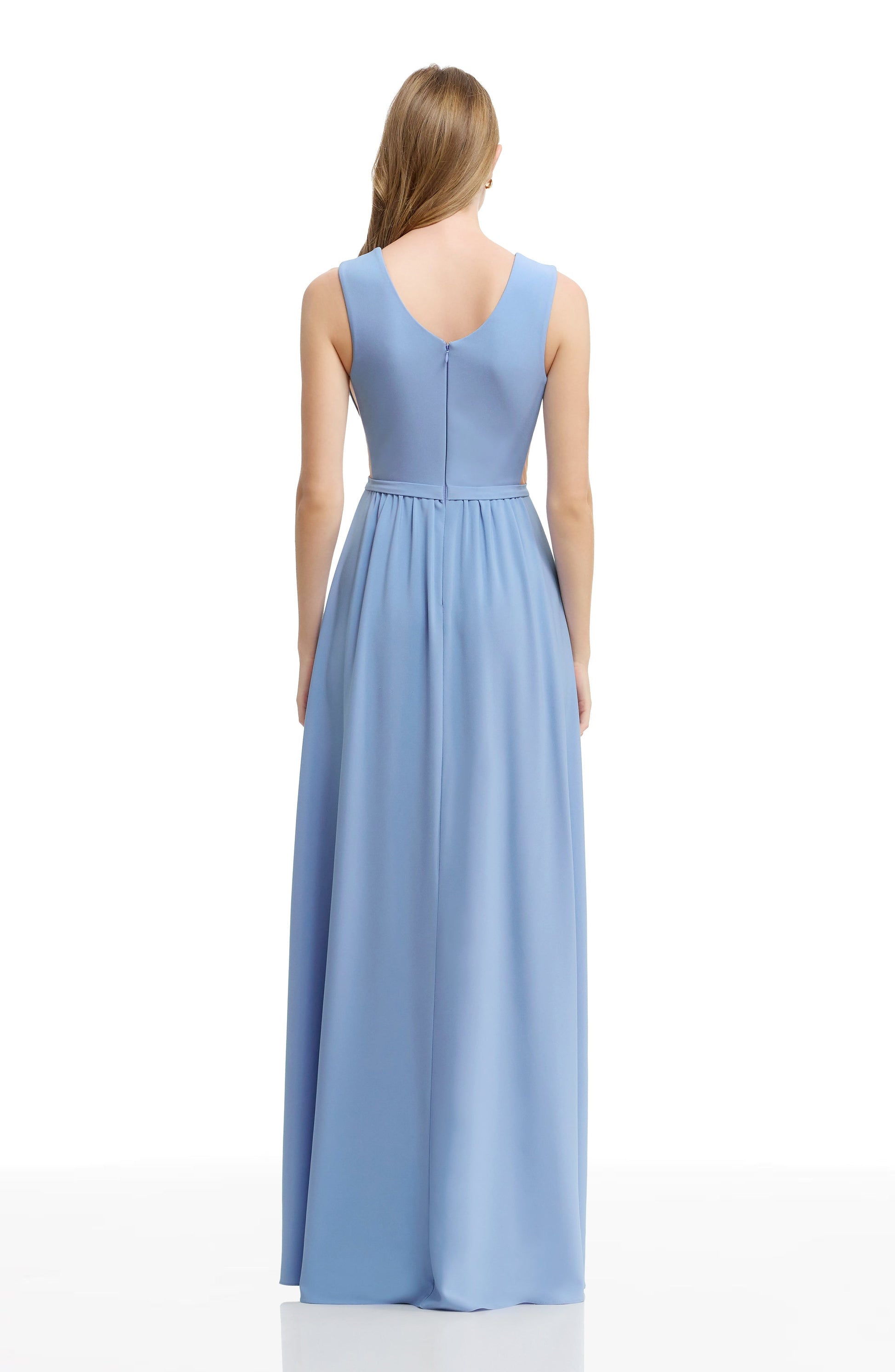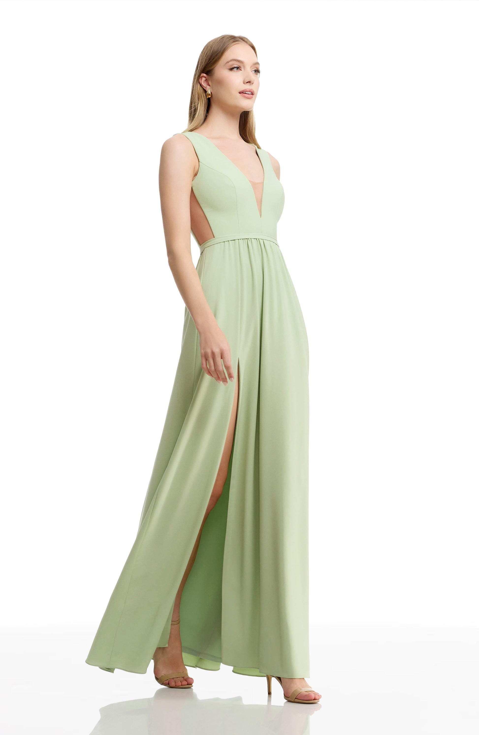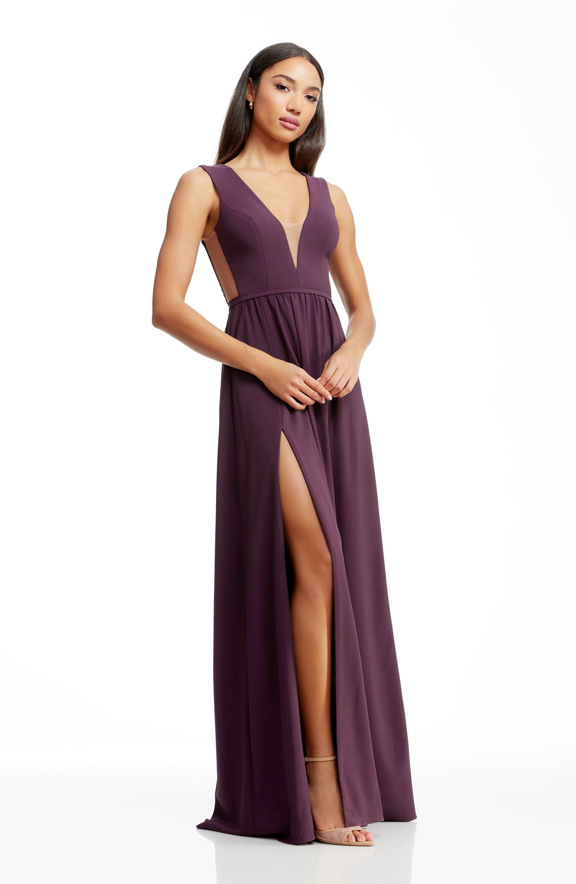 The Katrina Gown boasts a plunging neckline and sleek, modern design. Featuring a sleeveless silhouette, high side slit, and delicate mesh inserts, this dress exudes effortless beauty.