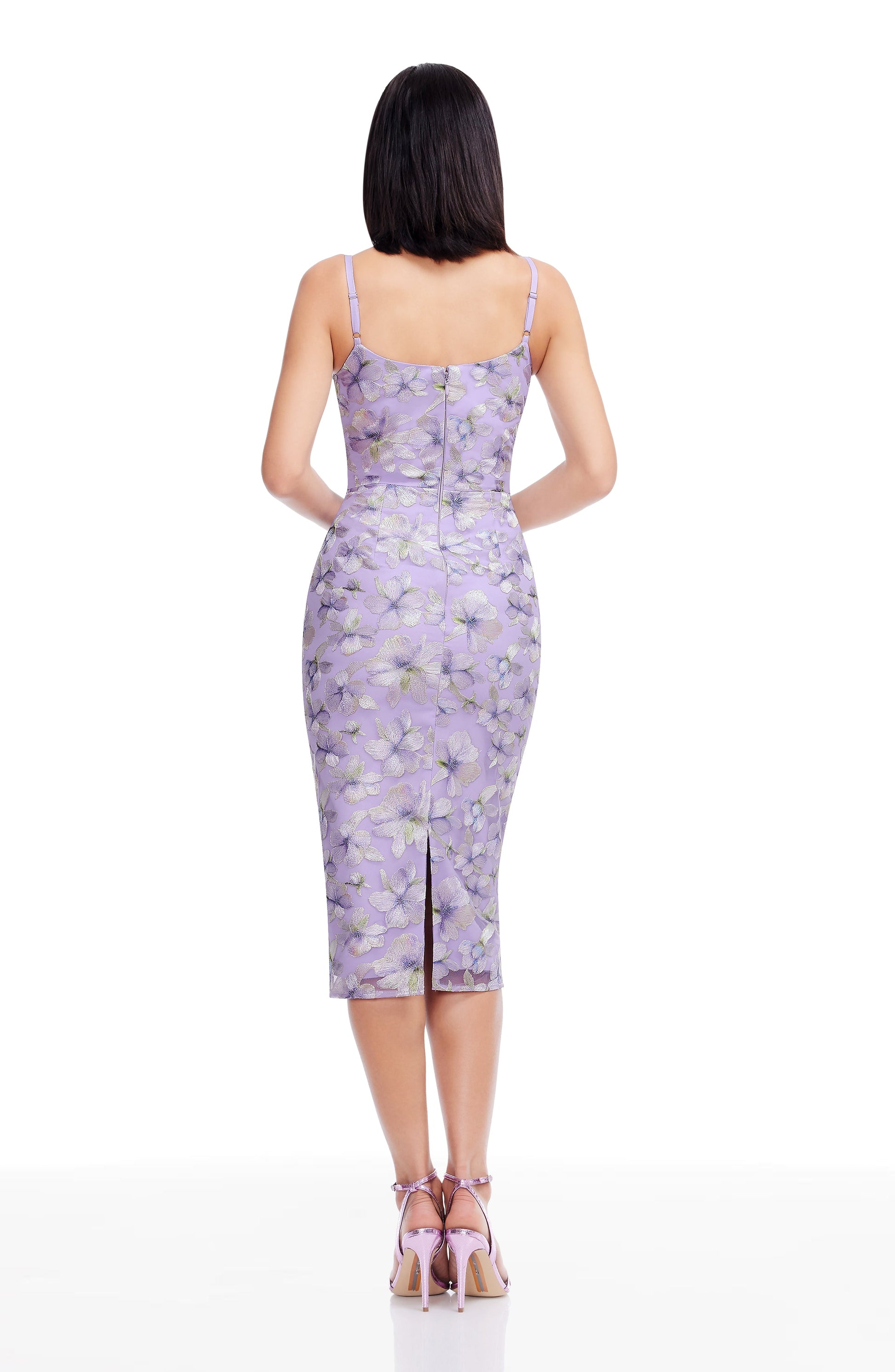 The Blakely Dress boasts a sleeveless, sweetheart design that showcases a bodycon silhouette in a chic midi length.