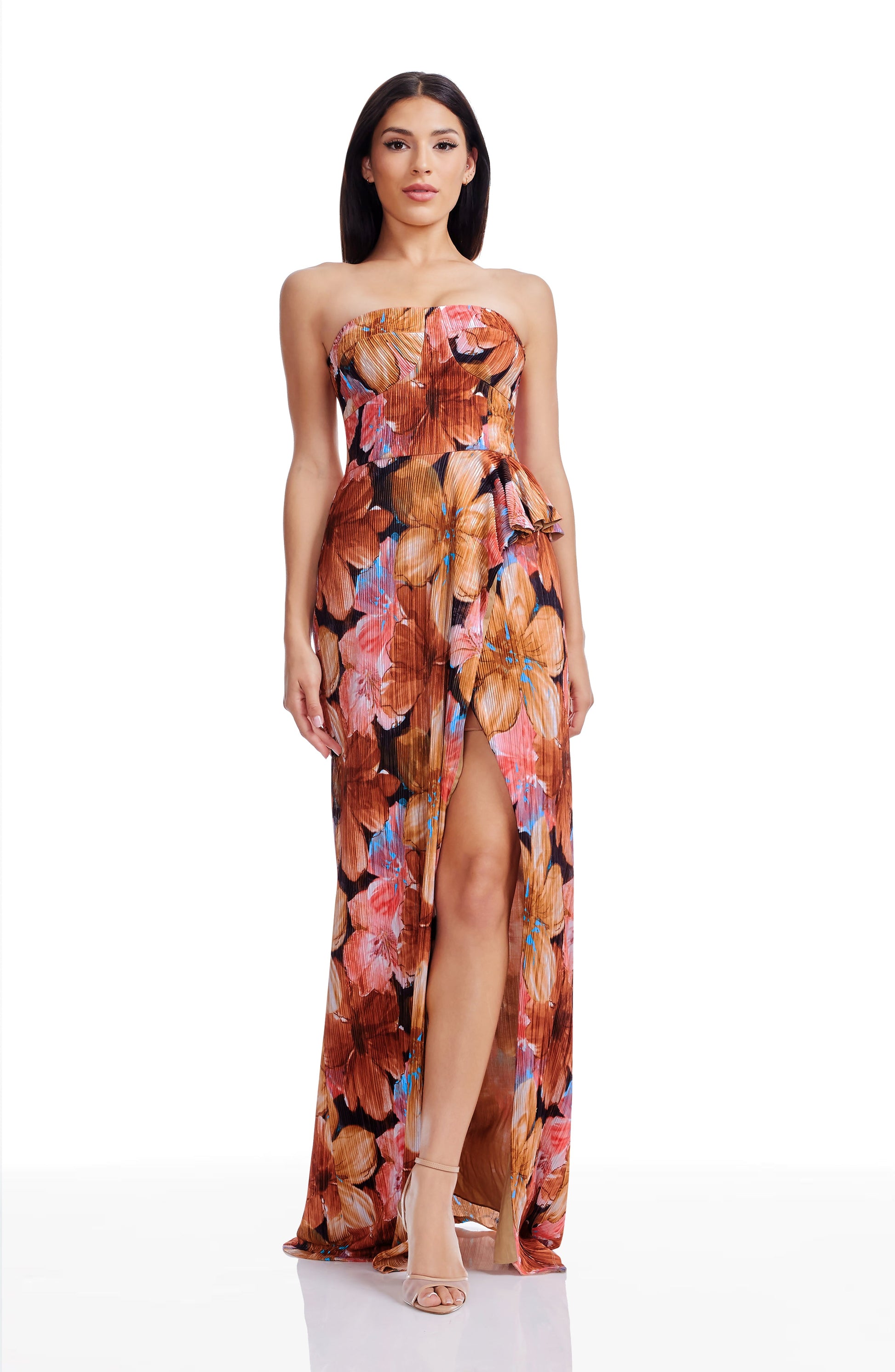 - Fit-and-flare shape with an asymmetrical draped skirt