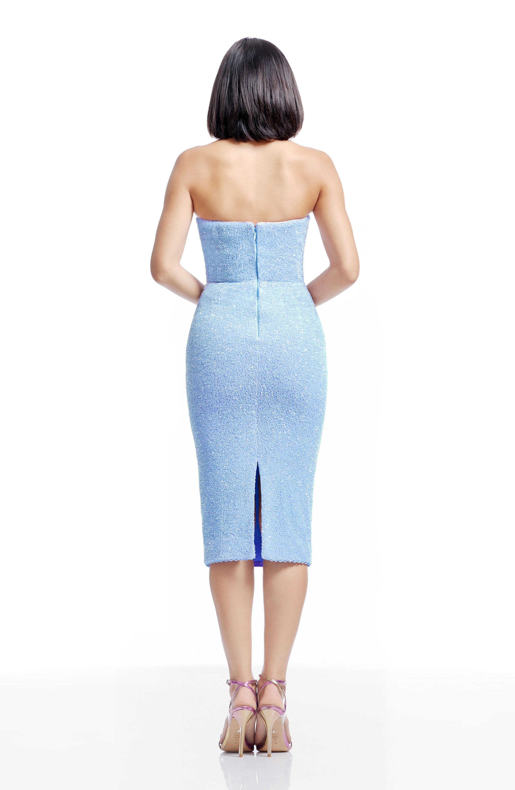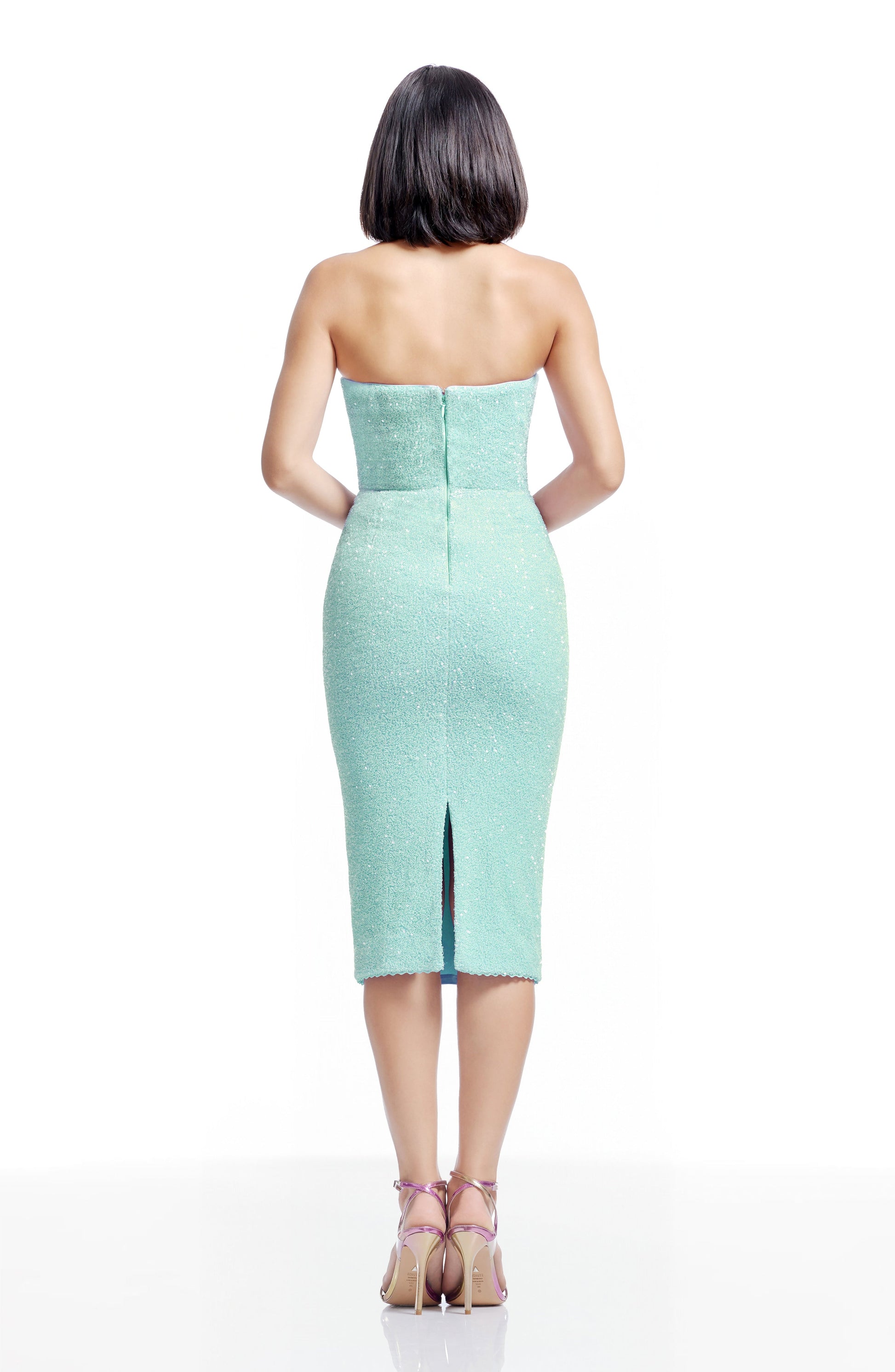 Sleek and alluring, this body-hugging midi dress features a strapless design for a touch of boldness.