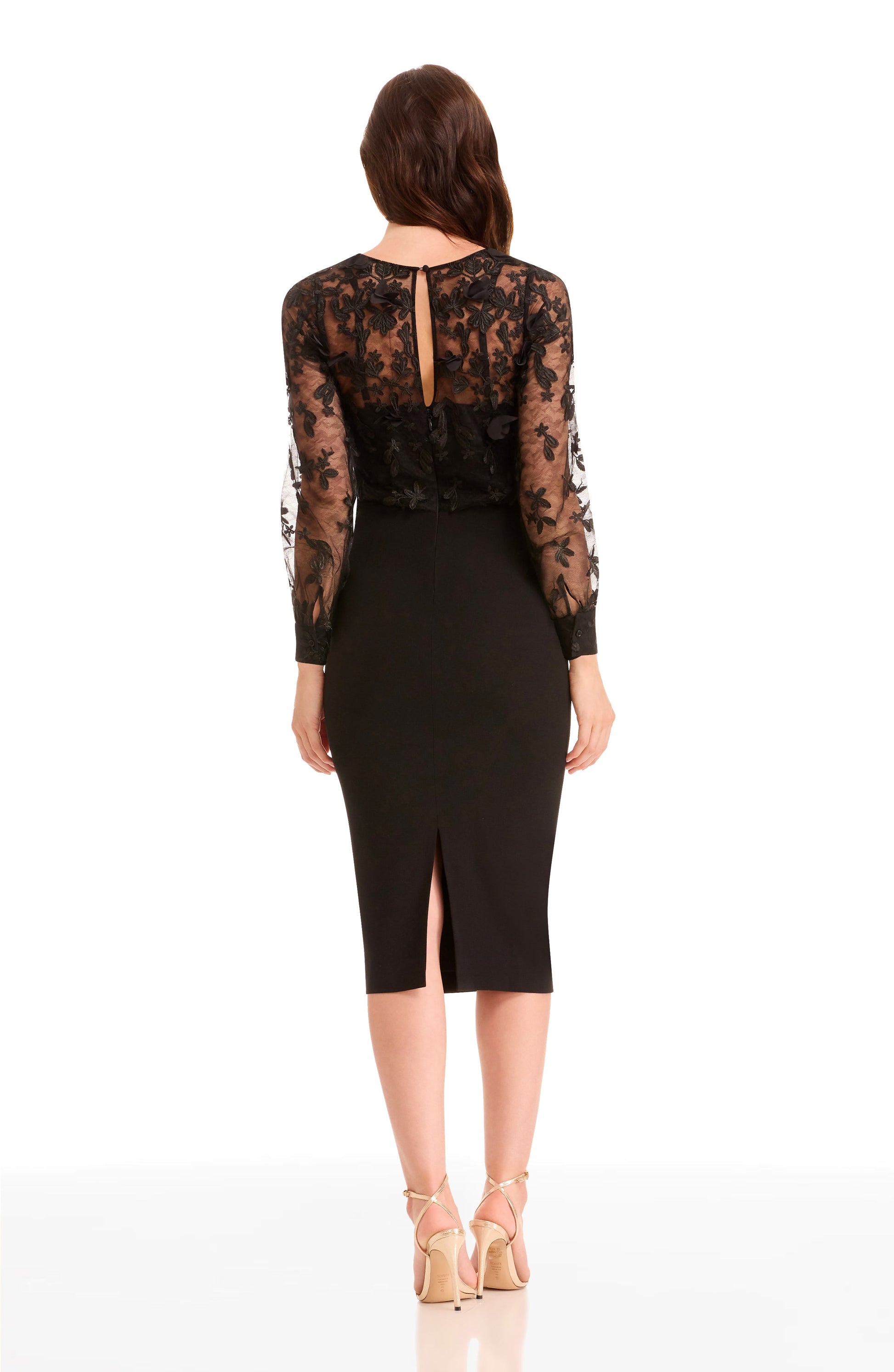 Indulge in the elegance of the Pilar Dress, featuring a fitted midi silhouette with a blouson bodice, pleated round neckline, and long sleeves.