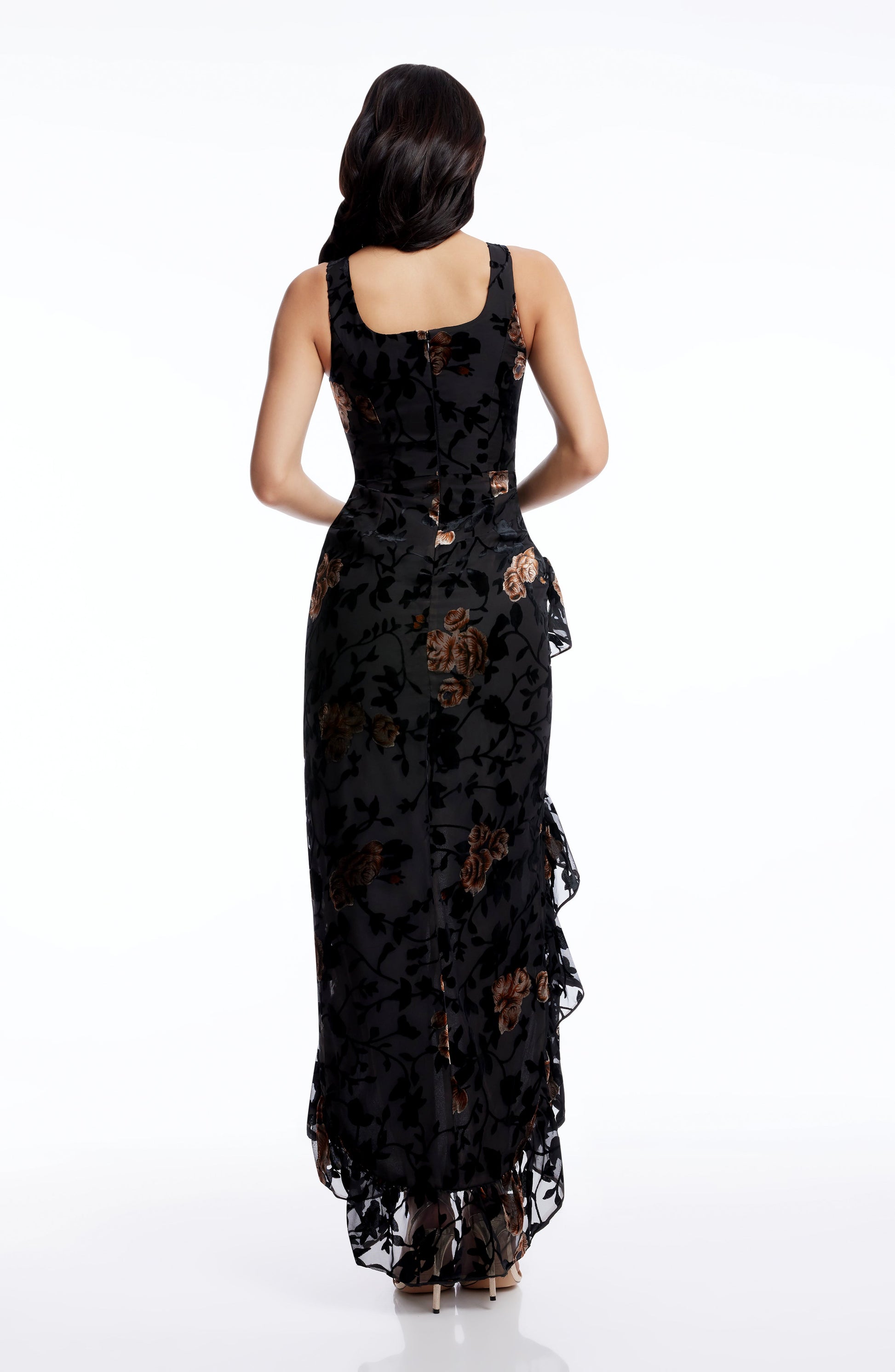 This Charlene Dress features a sleeveless design and a square neck, with a figure-flattering bodycon fit. The asymmetrical ruffle detailing adds a touch of elegance to this stunning mermaid gown.