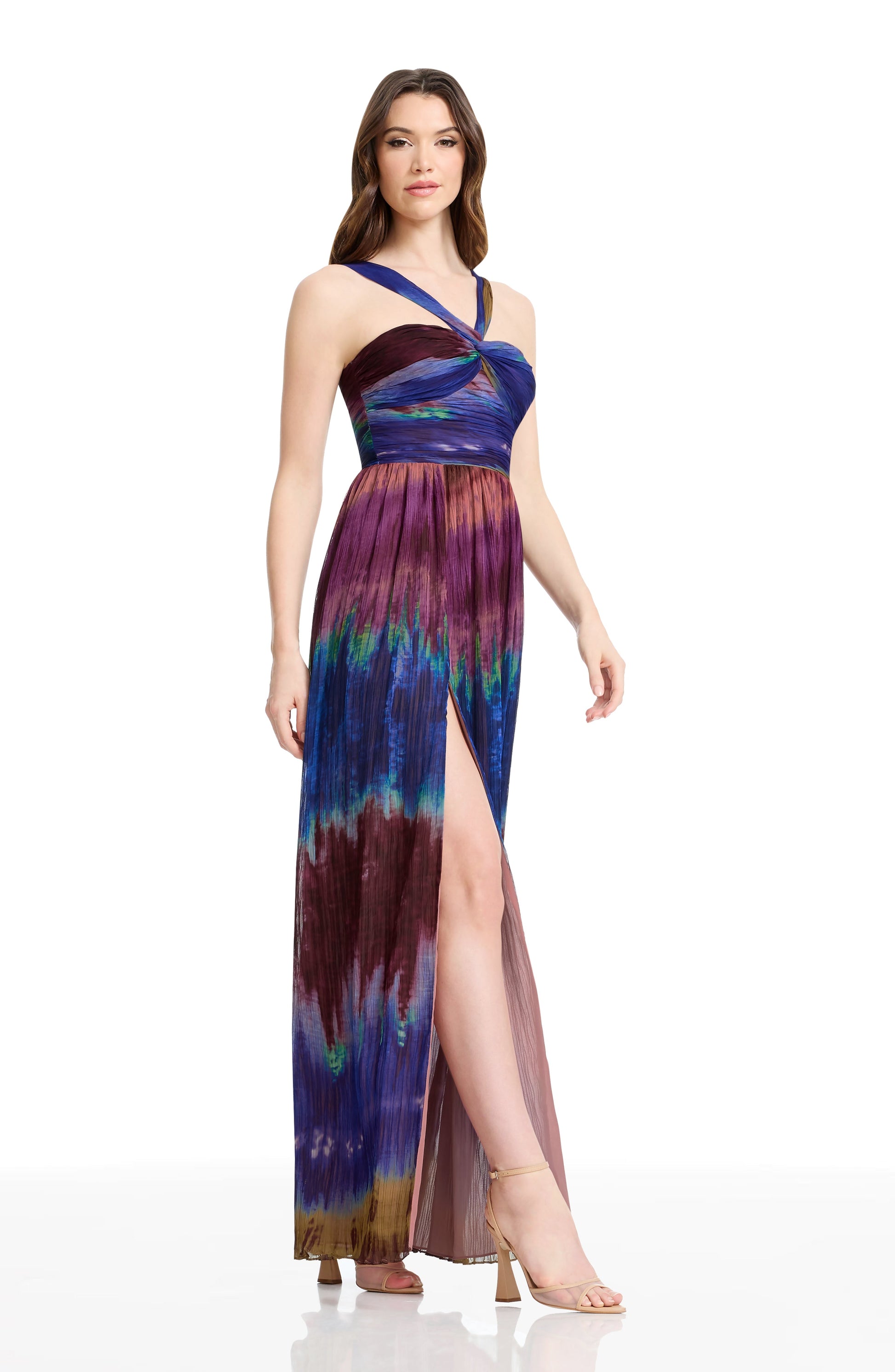 Tau is effortless and eye-catching—crafted in airy tie-dye chiffon with a softly structured bodice and flowing A-line skirt.