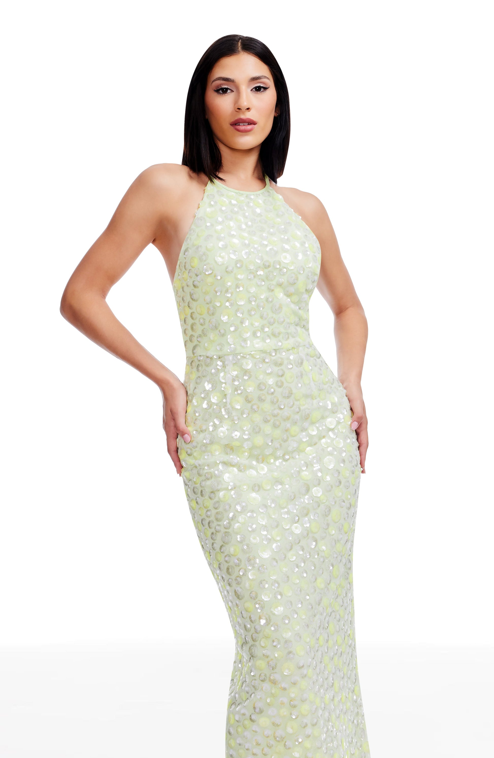 This exquisite Dani Dress features a halter neckline, body-hugging fit, and a sophisticated tea length design with a daring high slit. Elevate your style with this luxurious piece.
