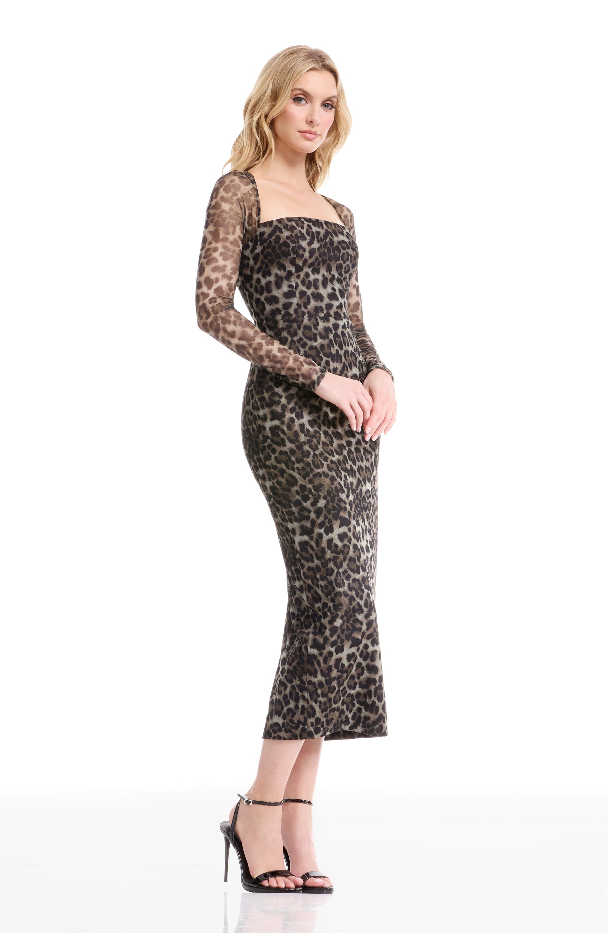 A fierce and flirty update to our Maxwell gown—Maxine turns heads with her bold leopard print and sheer detailing, now in a tea-length silhouette.