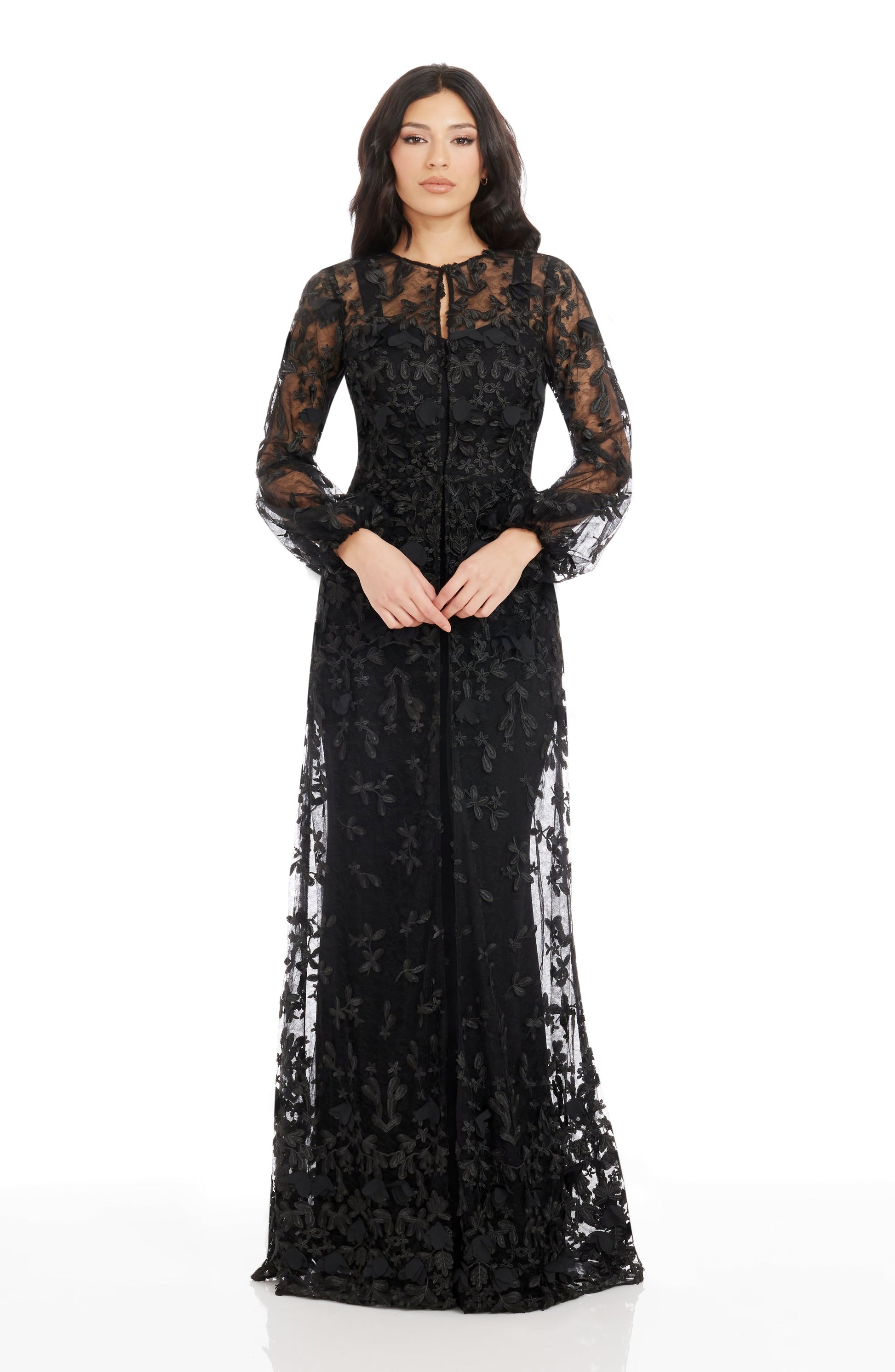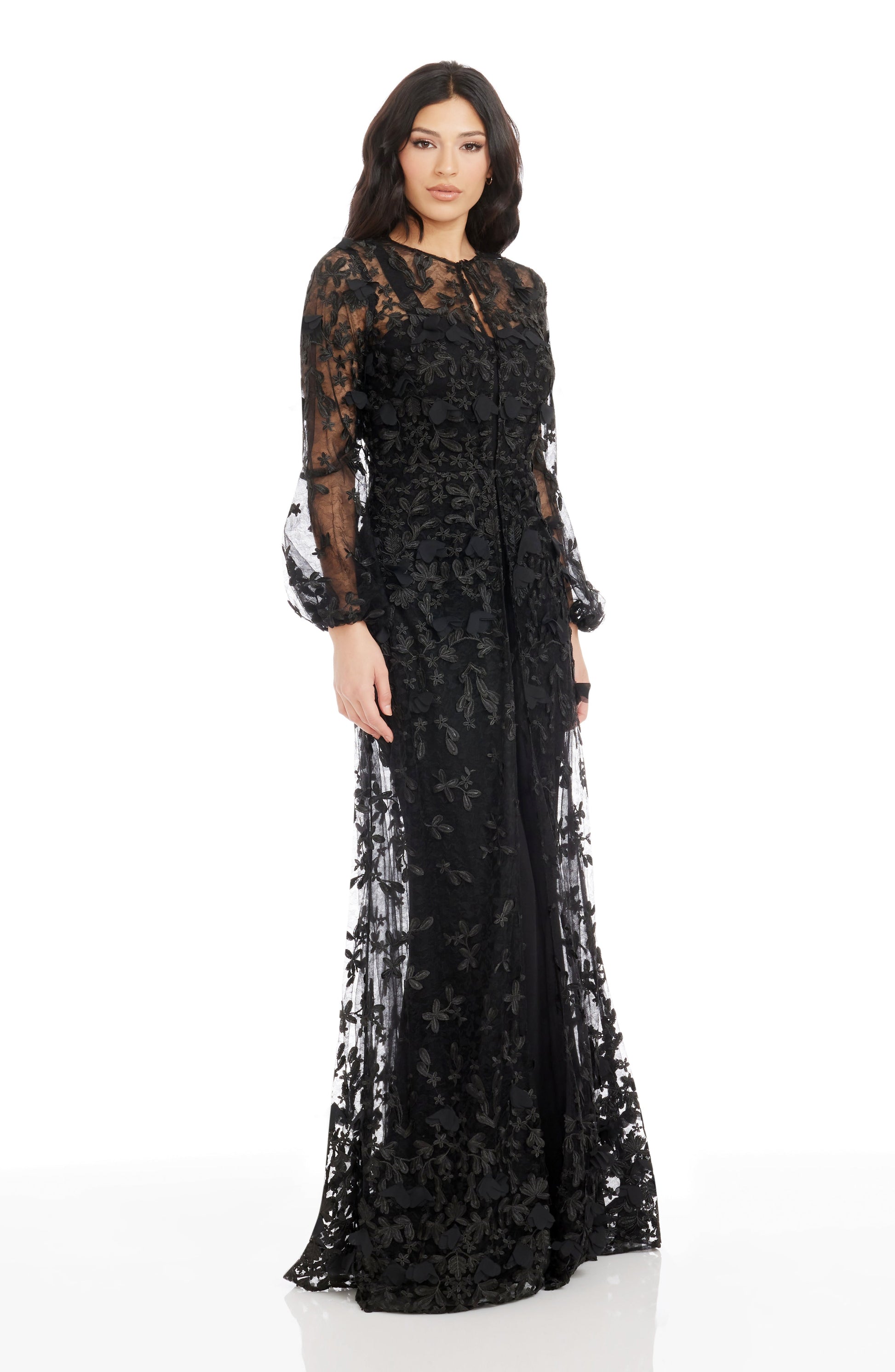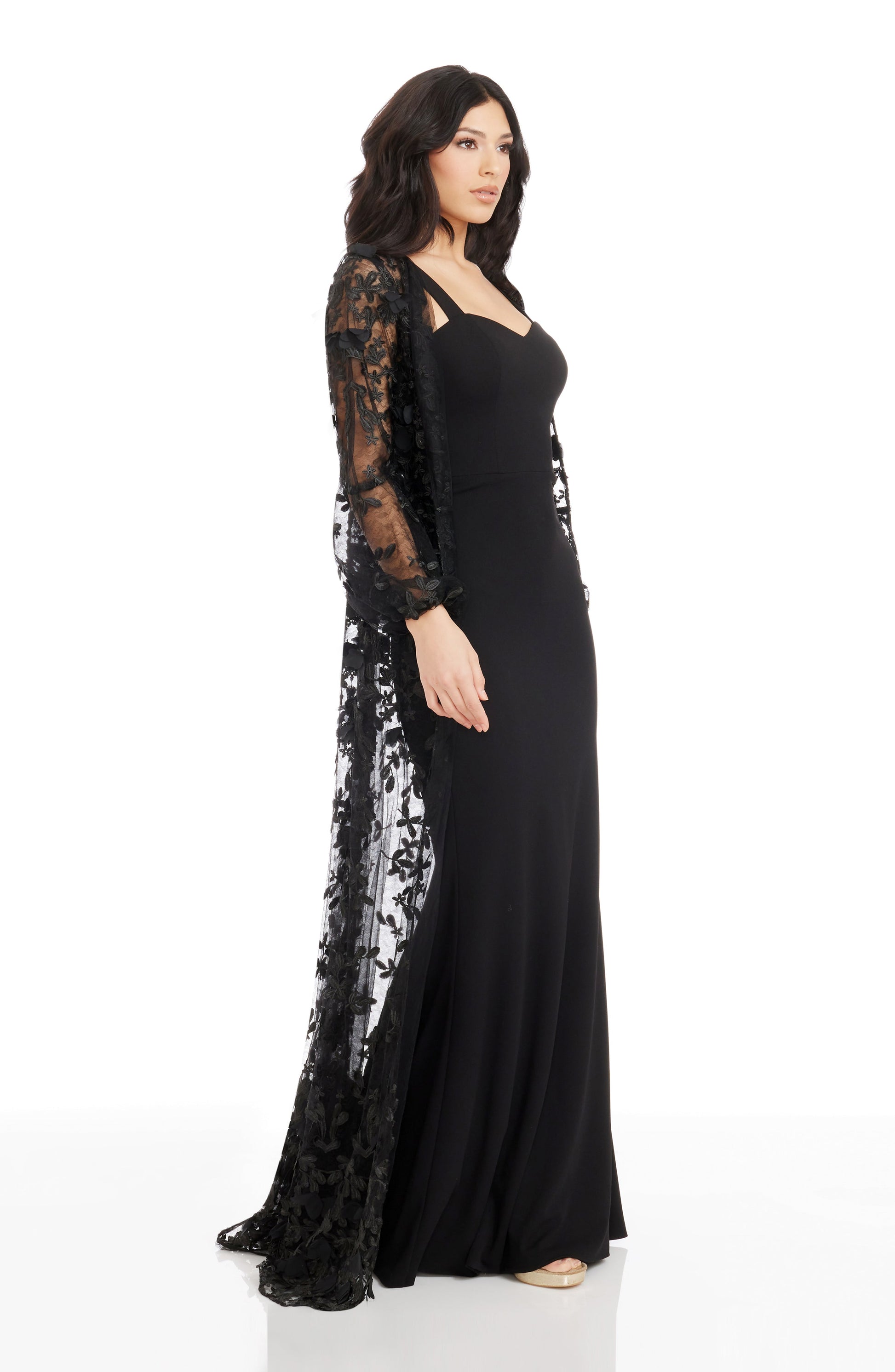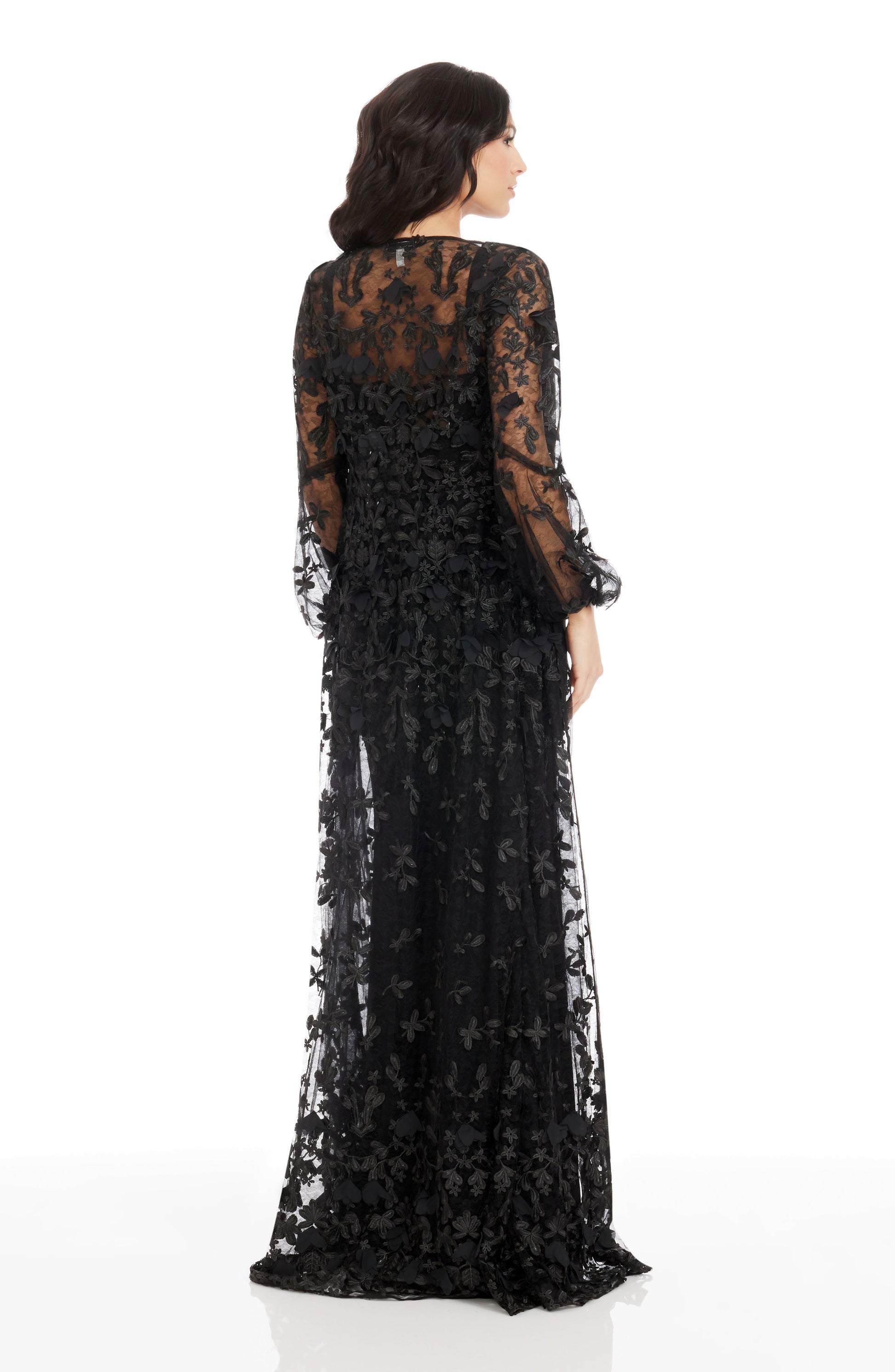 The Joss is a sophisticated collarless jacket with long blouson sleeves, designed to sweep the floor with its elegant length, adding a touch of refinement to any ensemble.