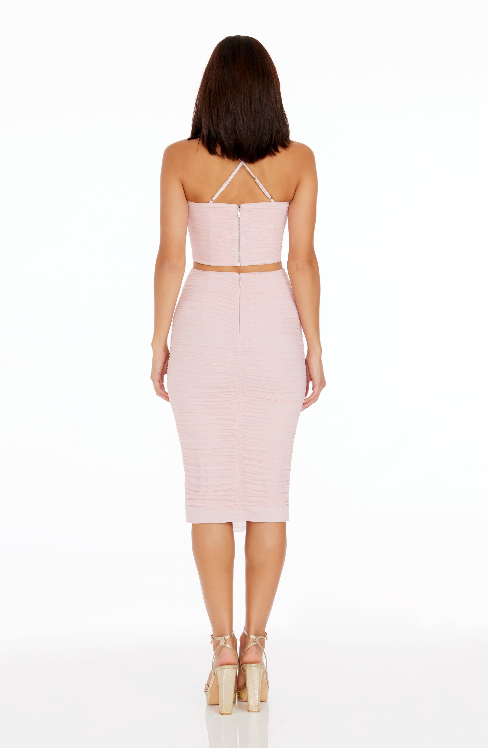 The Lynn Top is a form-fitting, mesh crop top featuring a stylish criss cross design at the back. It perfectly complements the Love Skirt for a coordinating trendy look.