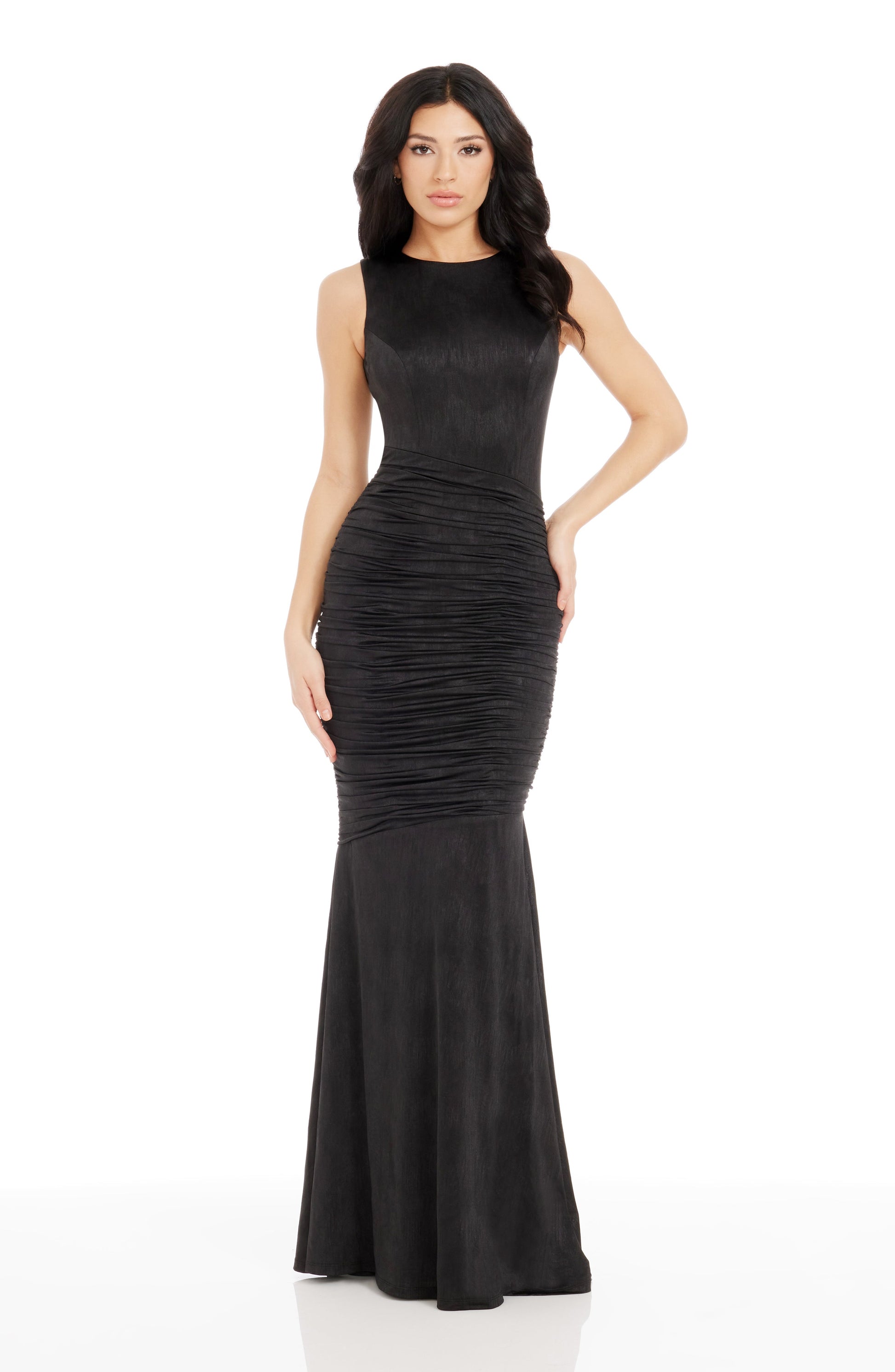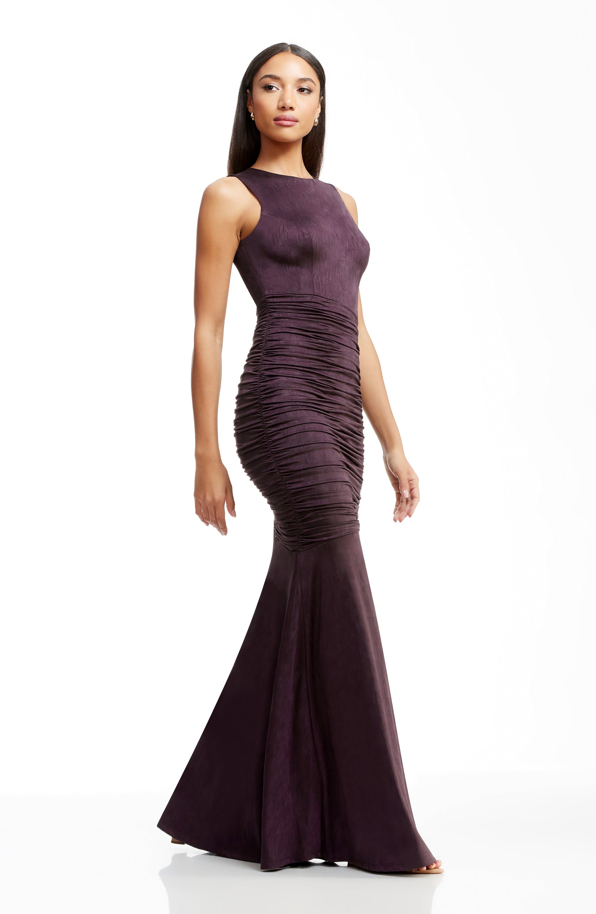 A sleeveless high-neck mermaid gown with ruched hips features a flattering silhouette for a sophisticated and elegant look.
